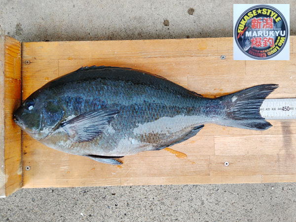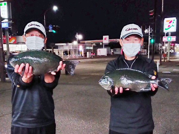 そこで、際に流してみる弟さん。すると、驚くほど結果が早く、即ヒット。35cmでした。同じように際を流すと、続けて46cmの良型が掛かってきました。お兄さんに、釣れたポイントを伝えると、こちらもまもなく際でヒット。体高のあるいい型でした。